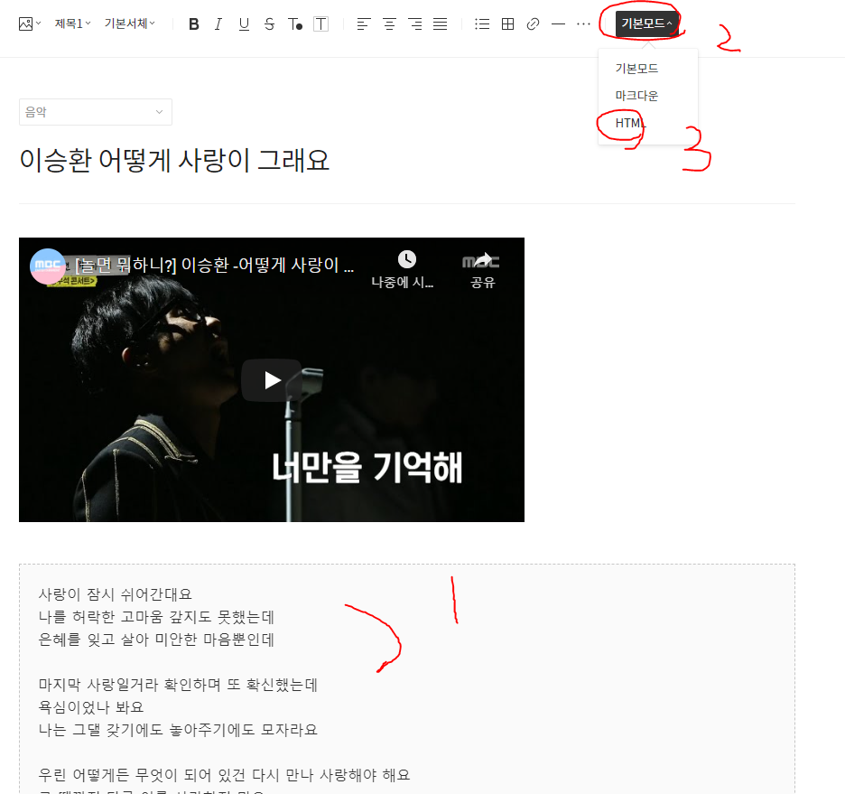 2. 내용입력(1) -> 기본모드클릭(2) -> HTML 클릭(3)