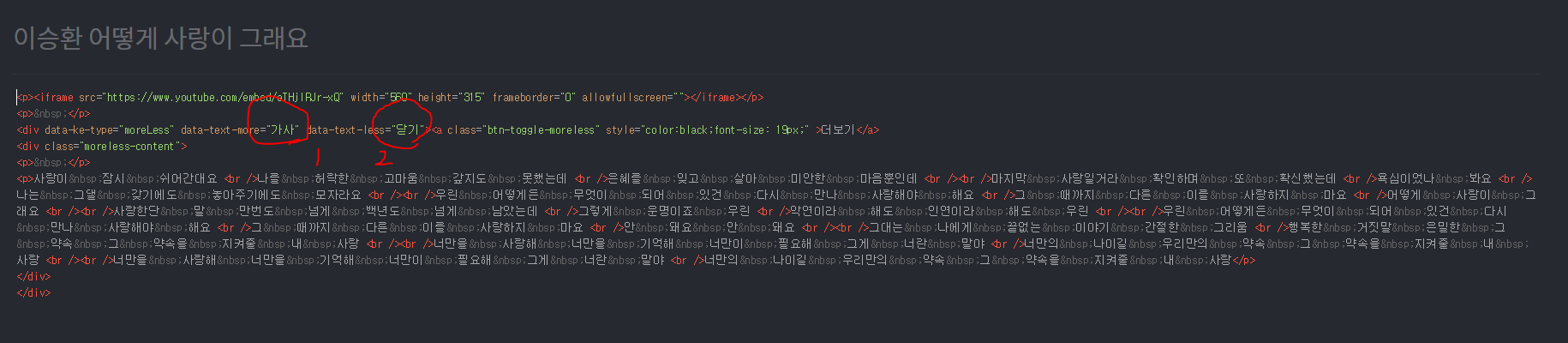 3. 더보기로 기본값 지정되어있는 클릭전 버튼 텍스트 가사로 변경(1) -> 닫기 텍스트 변경가능(2)
