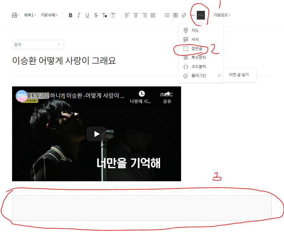 1. 글쓰기 페이지 -> ...클릭(1) -> 접은글 클릭(2) -> 영역 표출됨(3)