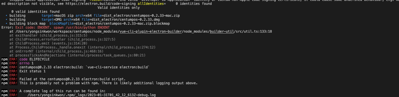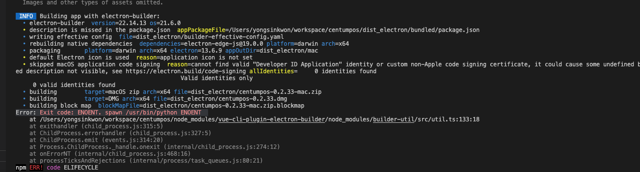 - builder-util is trying to call python because the package dmg-builder uses python scripts